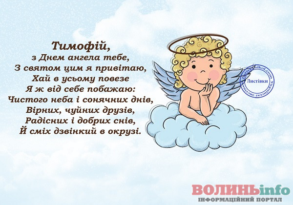 Вітаю з Днем Ангела Тимофія. Нехай ангел тебе не покидає, нехай удача від тебе не відходить, нехай мужність веде тебе до благородної перемоги. Від щирого серця бажаю здоров’я, любові, благополуччя, миру, радості, міцних сил і першості у всьому. Хай щастить!