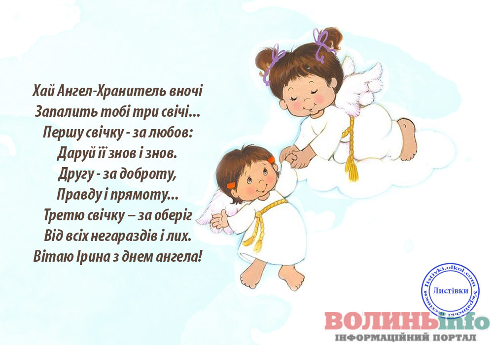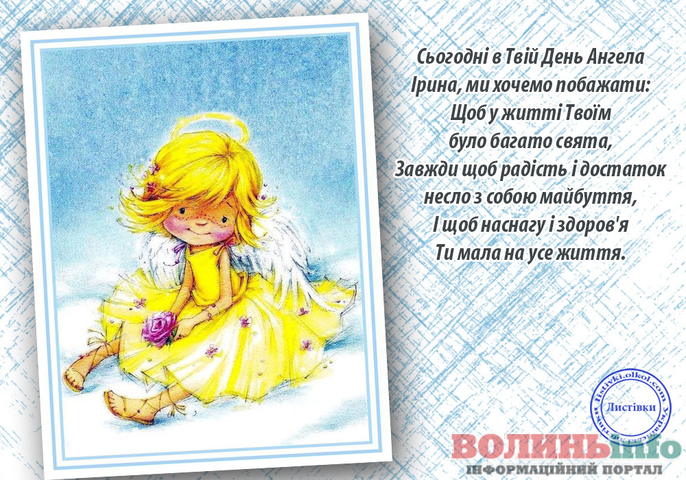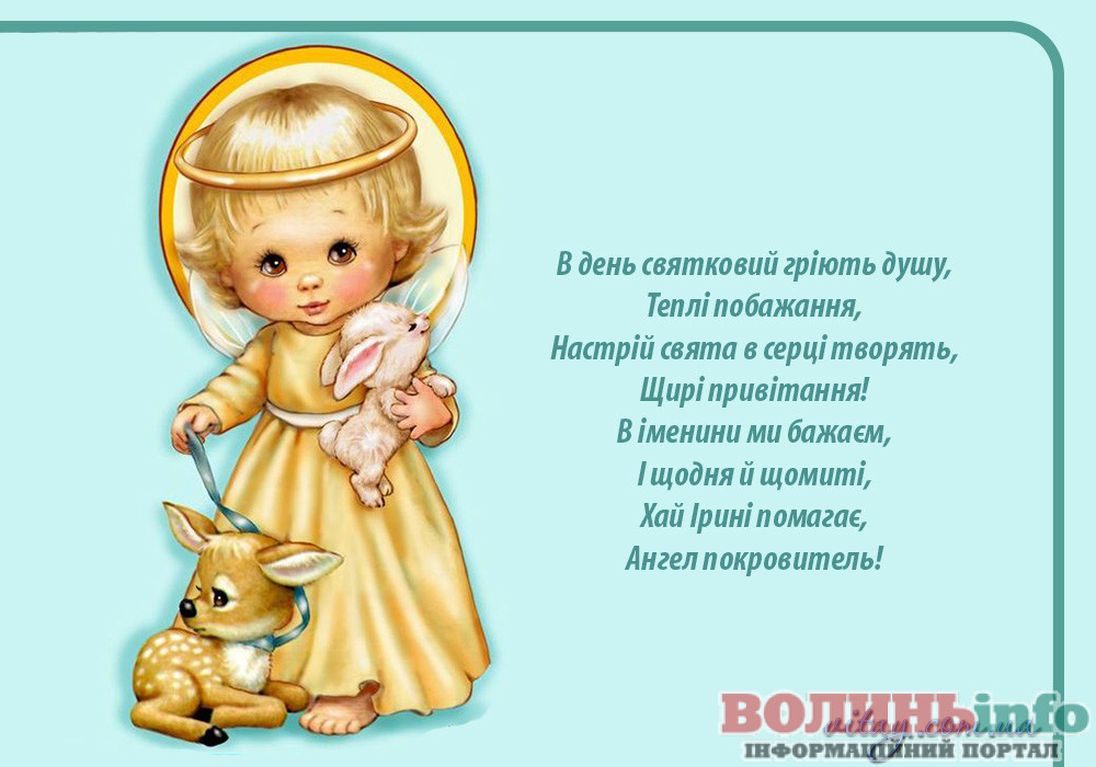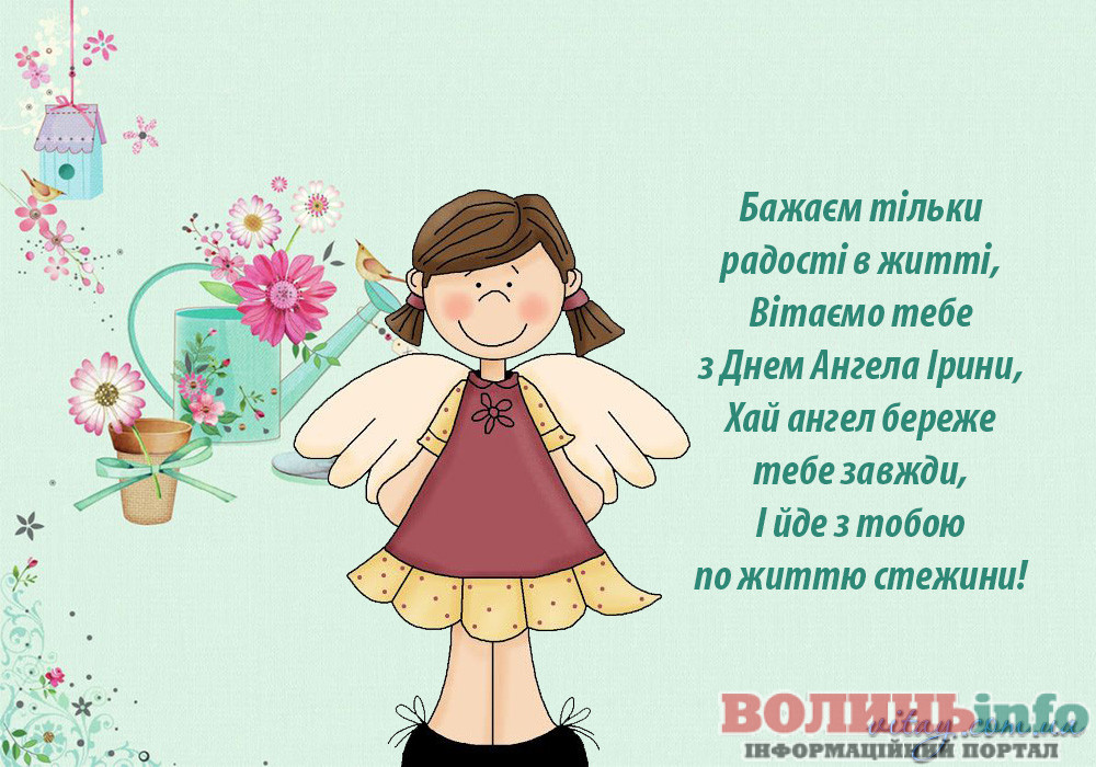 З Днем ангела тебе! Нехай добрий художник розфарбує твоє життя яскравими фарбами, а талановитий композитор напише мажорну мелодію твоєї долі. У сплячої красуні були феї, а твоєю феєю нехай буде твоя свята заступниця Іра. Бажаю тобі міцного здоров’я і сил, везіння, успіхів та удачі у всіх починаннях, здійснення заповітних бажань, вірних друзів і сімейного щастя!