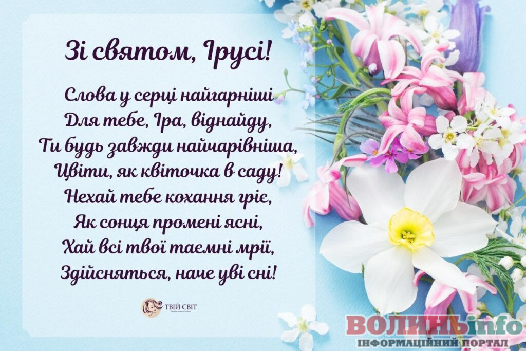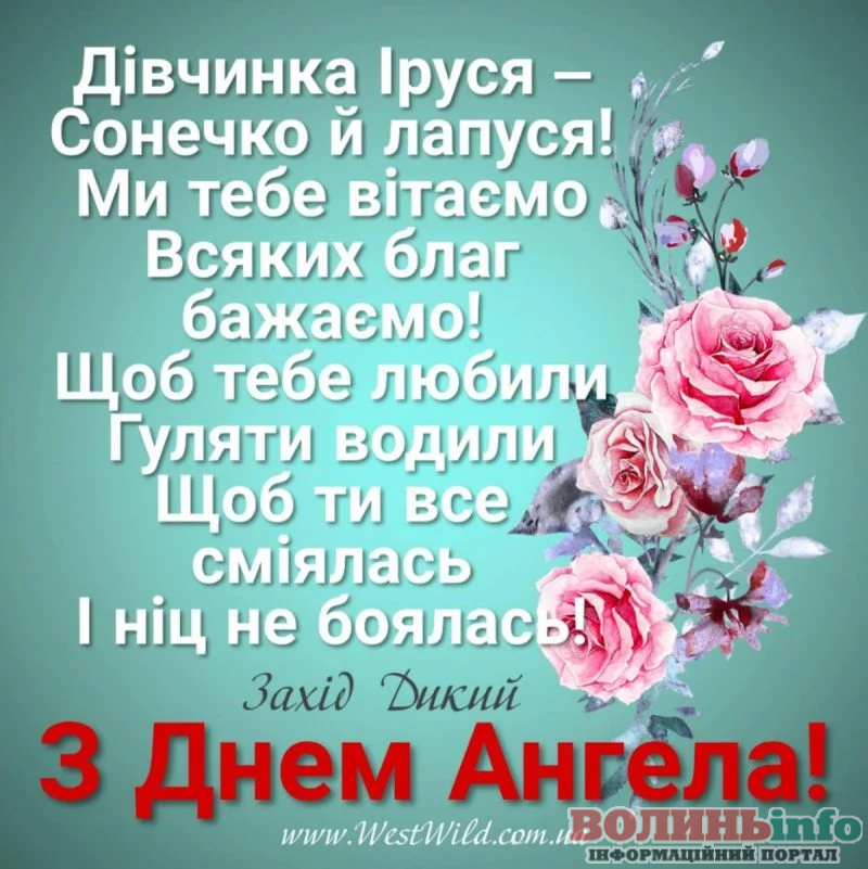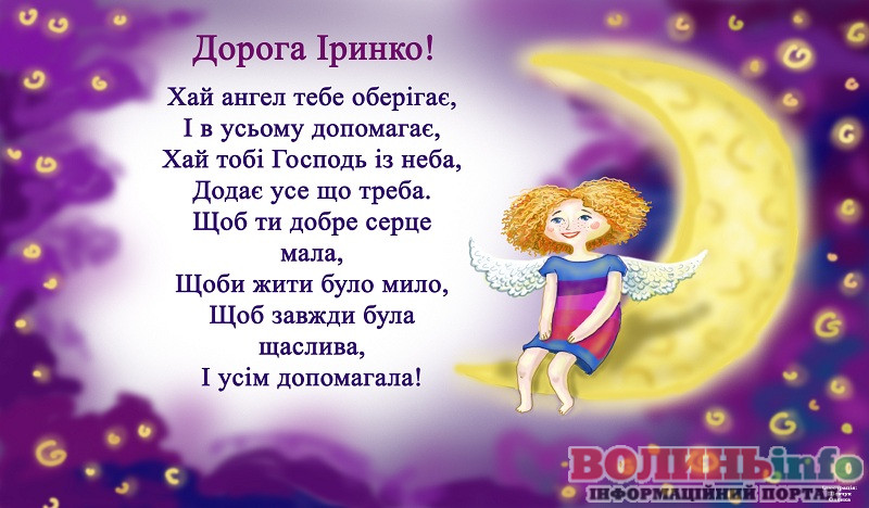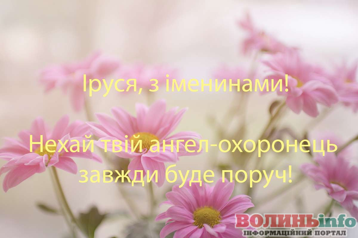 Ірусю, вітаю тебе з іменинами! Хай у твоєму житті буде більше сонячних днів і менше митей, коли опускаються руки. Хай ангел-охоронець оберігає від всіх бід, а на шляху не буває складних перешкод!