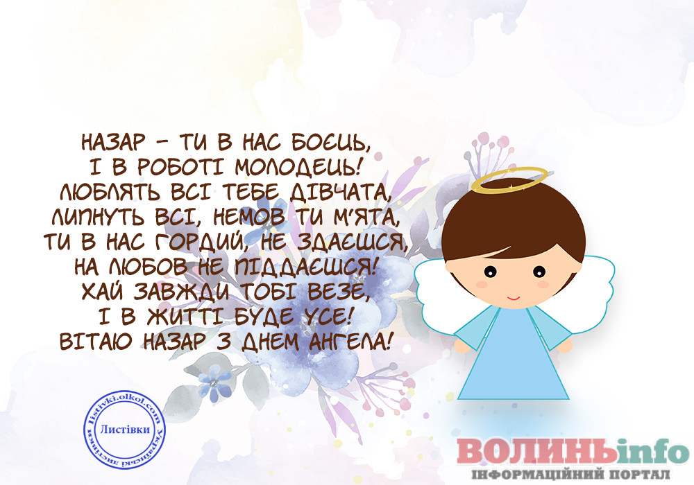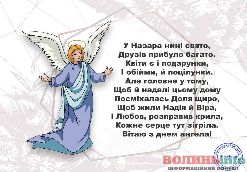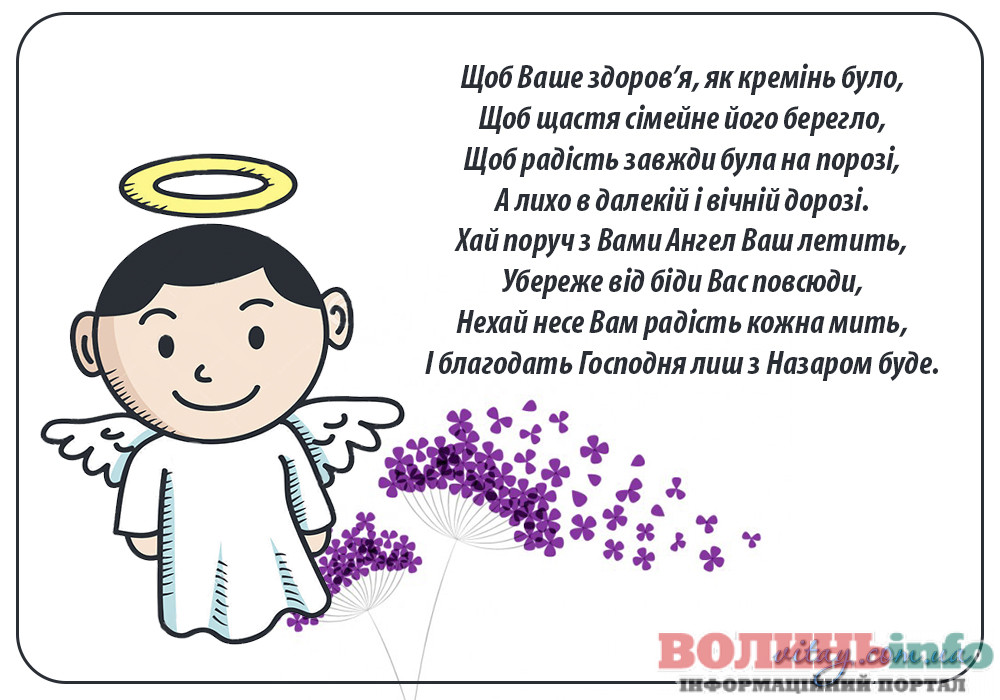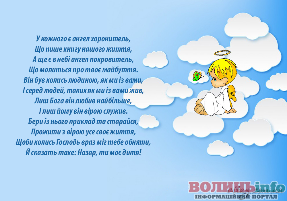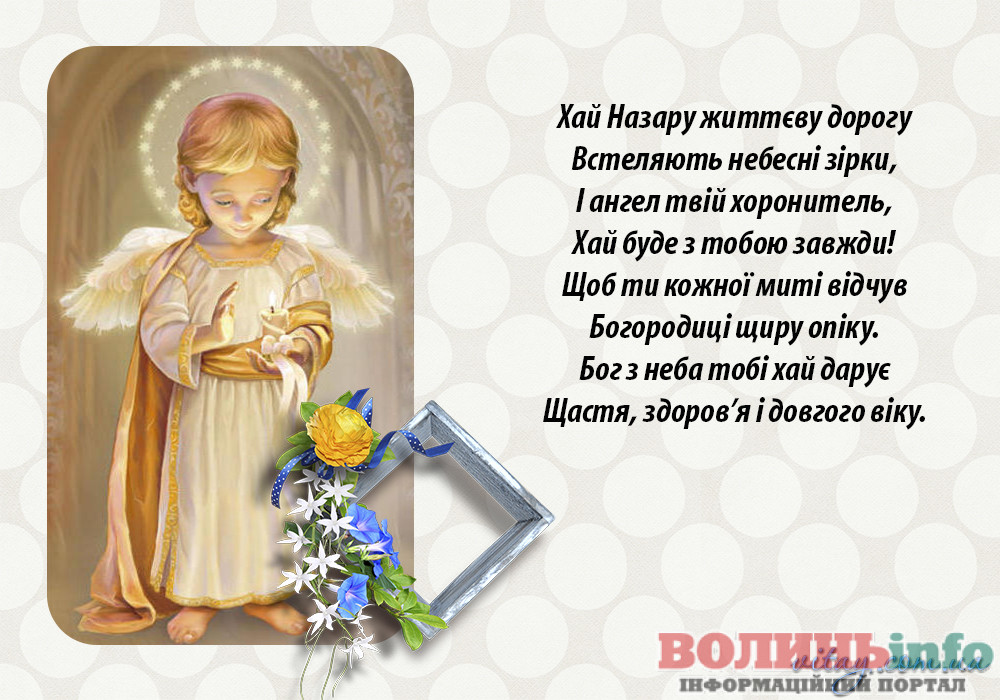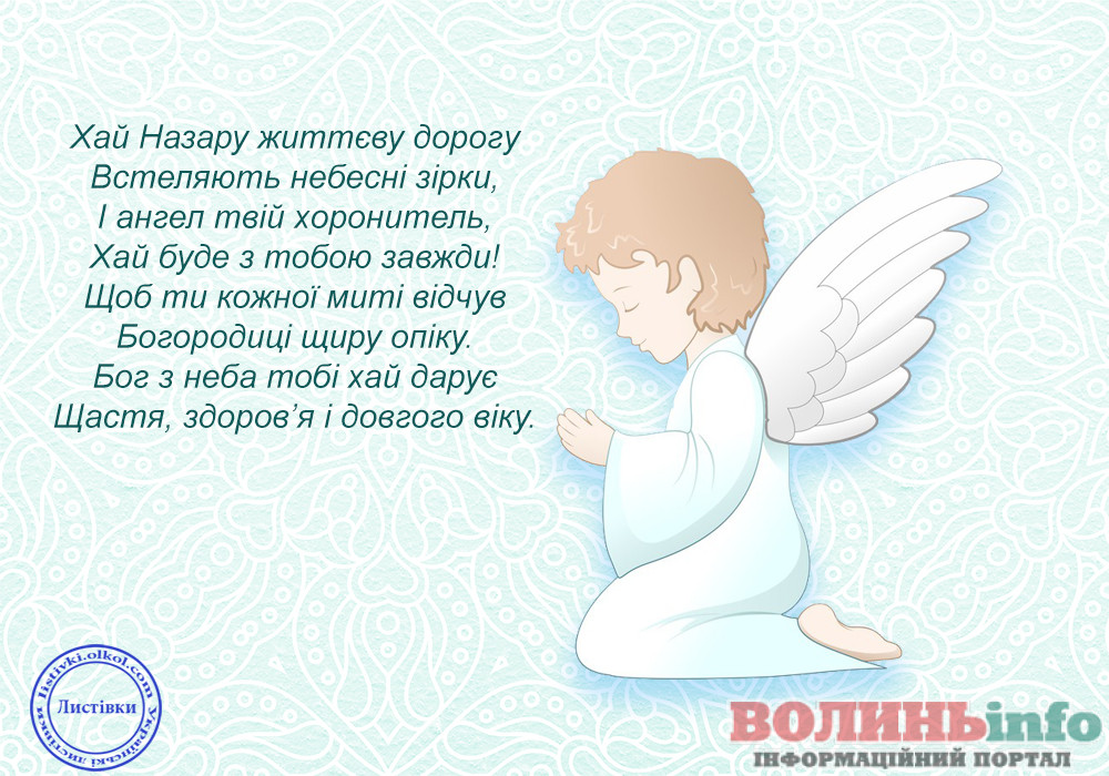 Дорогий Назар! Нехай твій ангела почує всі твої молитви і допоможе впоратися з усіма негараздами на життєвому шляху! Будь стійким у своїй вірі, допомагай нужденним, прощай людям їх помилки і будь милосердним по відношенню до близьких. Зі святом тебе!