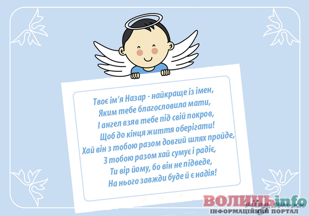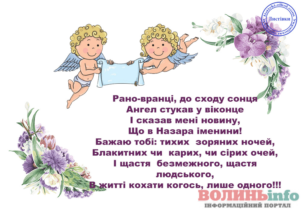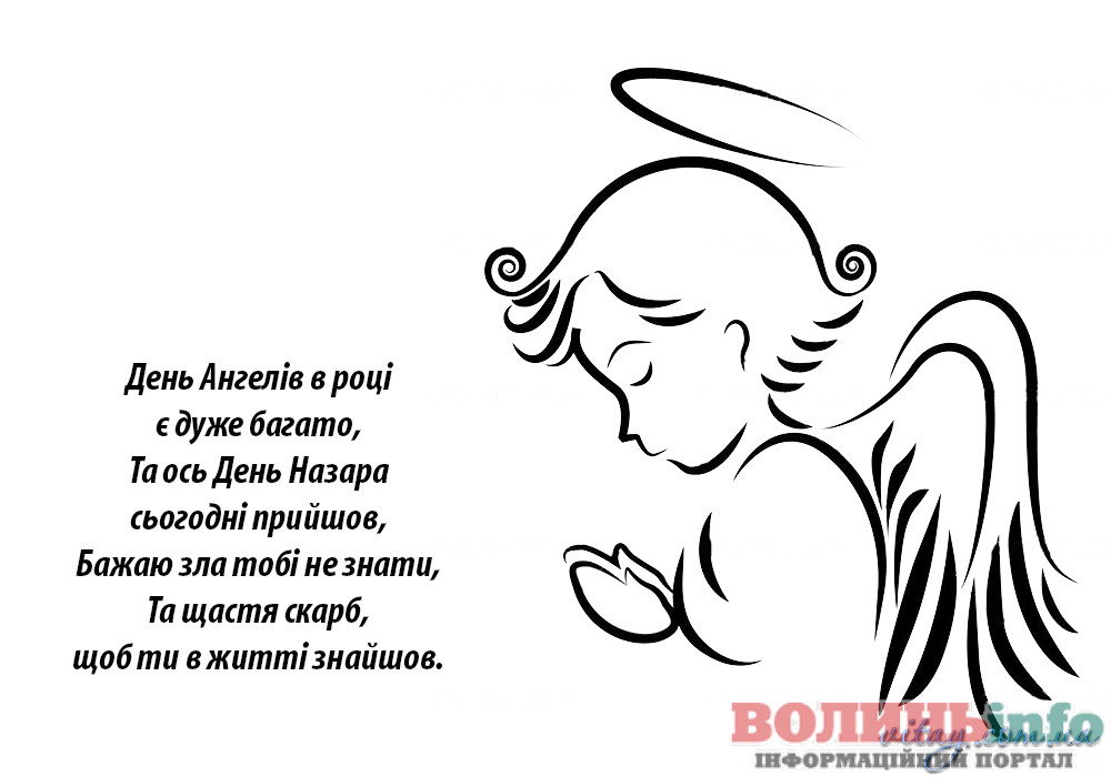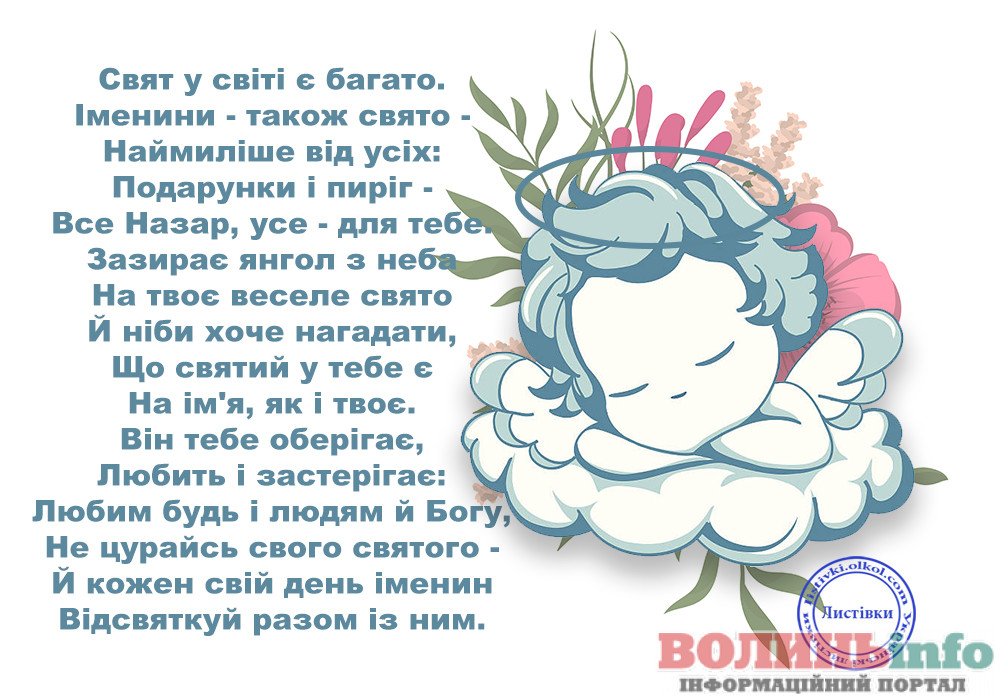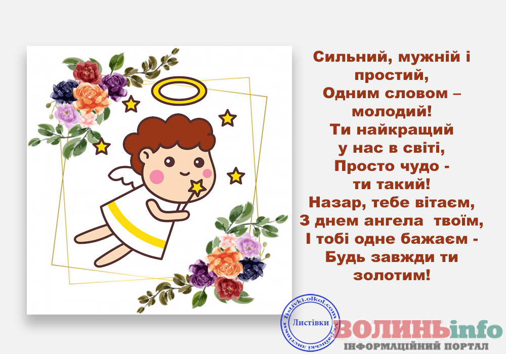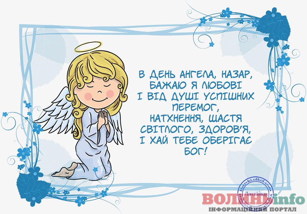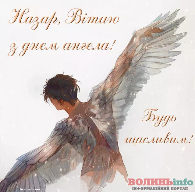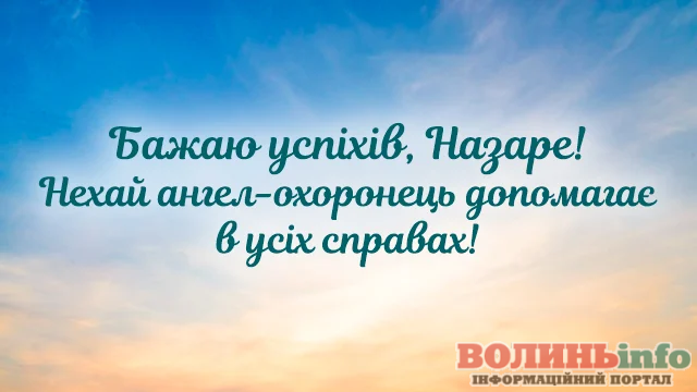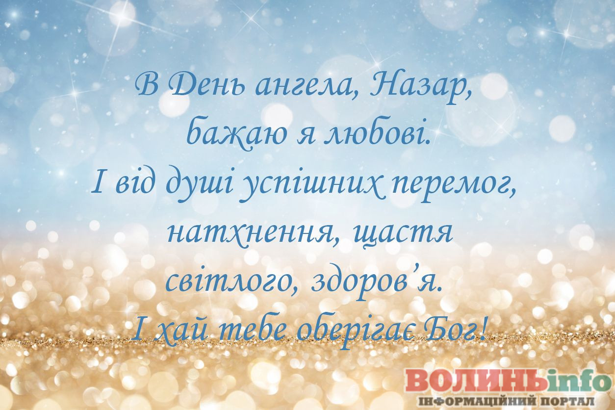 Дорогий Назар. Вітаю тебе з Днем Ангела. Хочу побажати тобі щирого і справжнього щастя, доброї і незмінної вдачі, великих і незламних успіхів, нереального і великого везіння, міцного і дуже міцного здоров’я. Хай твій ангел вберігає тебе все твоє життя.