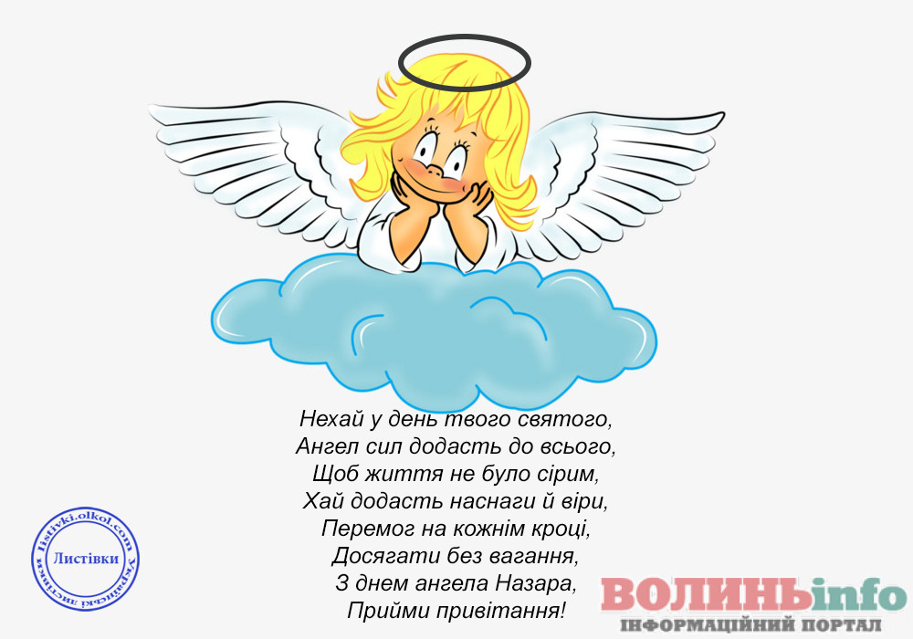 Вітаю з Днем Ангела Назара. Нехай ангел тебе не покидає, нехай удача від тебе не відходить, нехай мужність веде тебе до благородної перемоги. Від щирого серця бажаю здоров’я, любові, благополуччя, миру, радості, міцних сил і першості у всьому. Хай щастить!