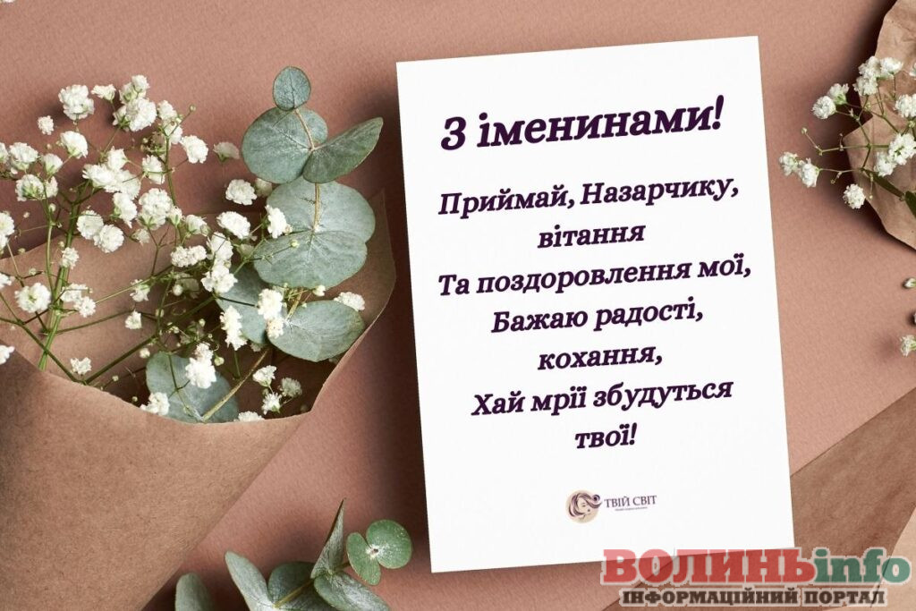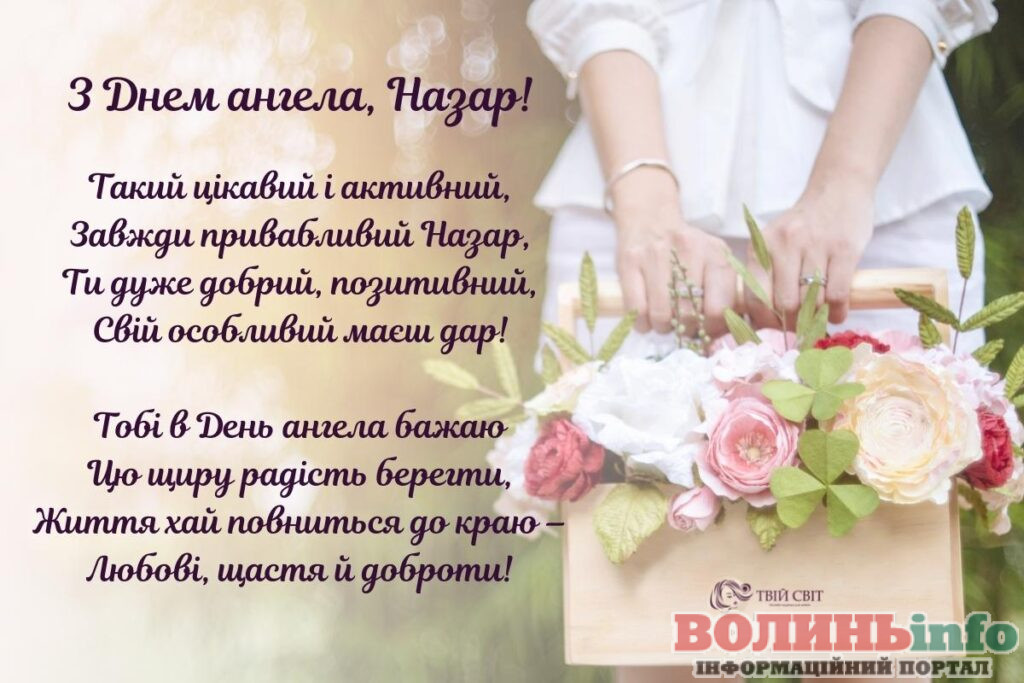 Назар. В День твого Ангела Назара хочеться побажати тобі, щоб твоє світле, радісне життя було наповнене любов’ю до ближніх, щастям, добробутом. Нехай близькі завжди радують, друзі будуть поруч і все в житті складається вдало.