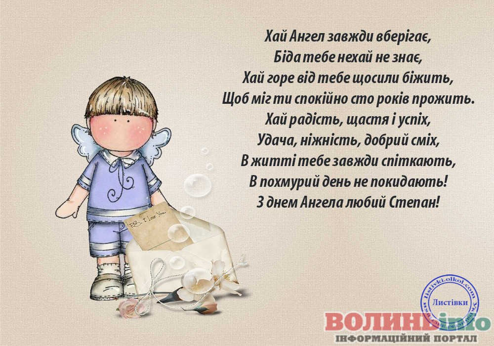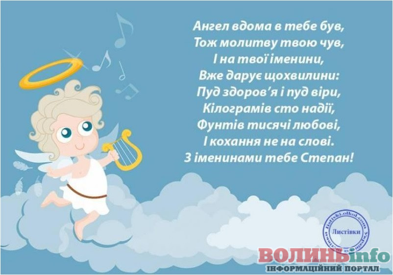 Степане, прийми мої щирі привітання з днем ангела! Бажаю впевненості та завзятості в досягненні цілей, йти вперед, не помічаючи перешкод! Нехай приємні відчуття, емоції та незабутні враження змінюють одне одного, немов у калейдоскопі! Живи яскраво і завжди усміхайся!