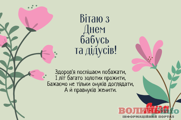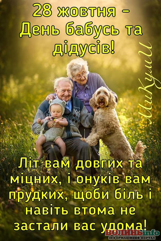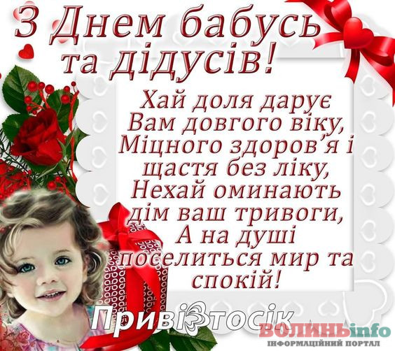 Вітаю з Днем бабусь та дідусів. Від щирого серця бажаю міцного здоров’я, бадьорості душі та оптимізму серця, щоб можна було і за городами стежити, і з онуками весело грати! Нехай онуки будуть гордістю для вас, нехай щодня вони вас радують щасливими посмішками та теплими обіймами!