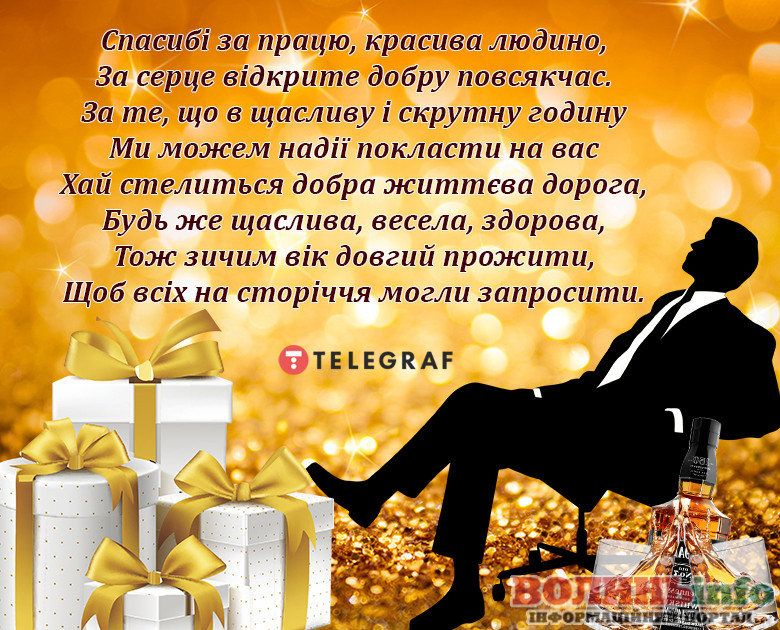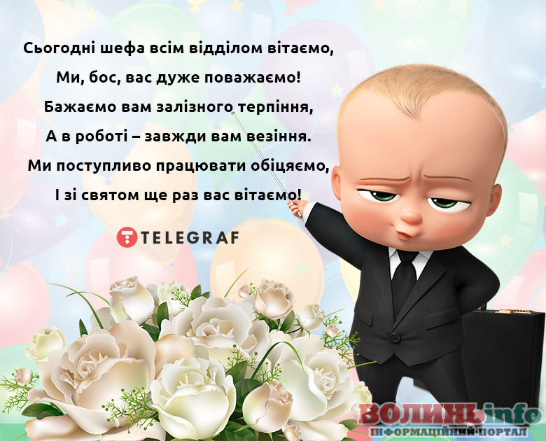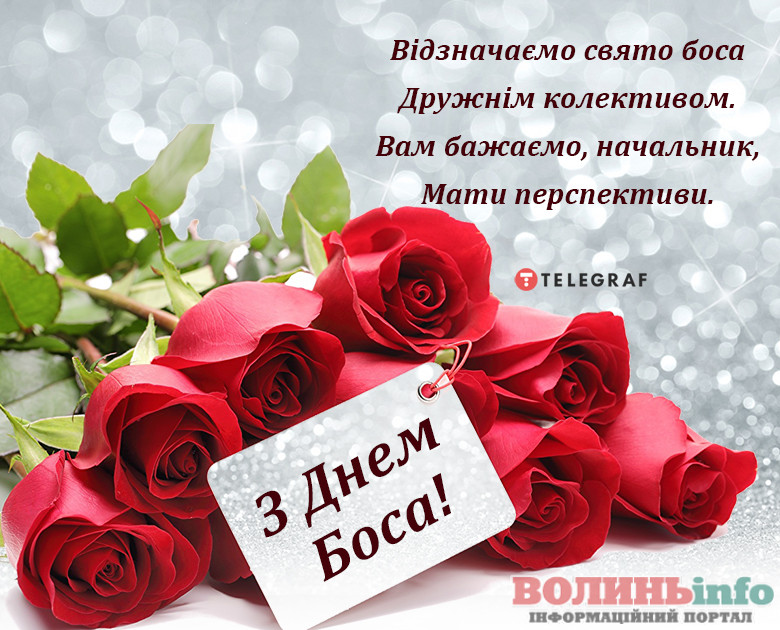 Дорогий шеф, вітаю з днем боса. Бажаю постійного вдосконалення, стабільності в справах, удачі і хорошої результативності. Нехай в житті буде багато щастя, любові, посмішок, радості і веселощів. Здоров’я Вам і Вашим близьким, поваги колег та взаєморозуміння.