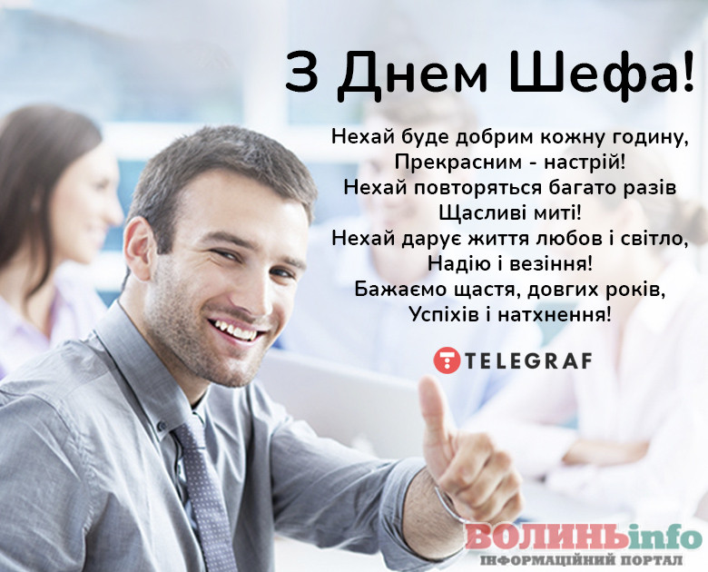 Вітаю з Днем Шефа. Бажаю твердості характеру, сміливих амбіцій, раціональних ідей і безсумнівного процвітання. Бажаю бути відмінним босом, бажаю залишатися чудовою людиною. Нехай справи впевнено рухаються в бік успіху. Нехай життя веде рахунок щасливим і вдалим днях.