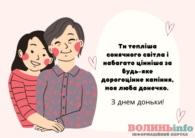 З Днем доньки! Ти моя найкраща подружка, моя таємниця та моя радість. Бажаю тобі завжди бути такою ж доброю, щирою, веселою та красивою. Нехай у тебе все буде чудово!