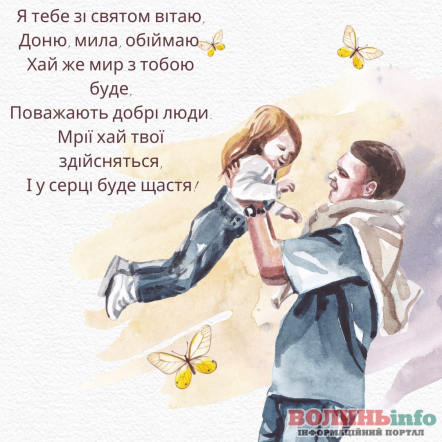 Моя люба, донечко, зі святом! Щирості й любові, нескінченного кохання та захвату від кожної миті життя! Нехай доля тобі завжди усміхається й обдаровує лише найкращим! Бажаю, аби у тебе виходило все, що ти тільки собі надумаєш. Вірних друзів тобі і соратників, люблячих та розуміючих людей поруч. Просто будь щасливою та коханою – ти цього варта!