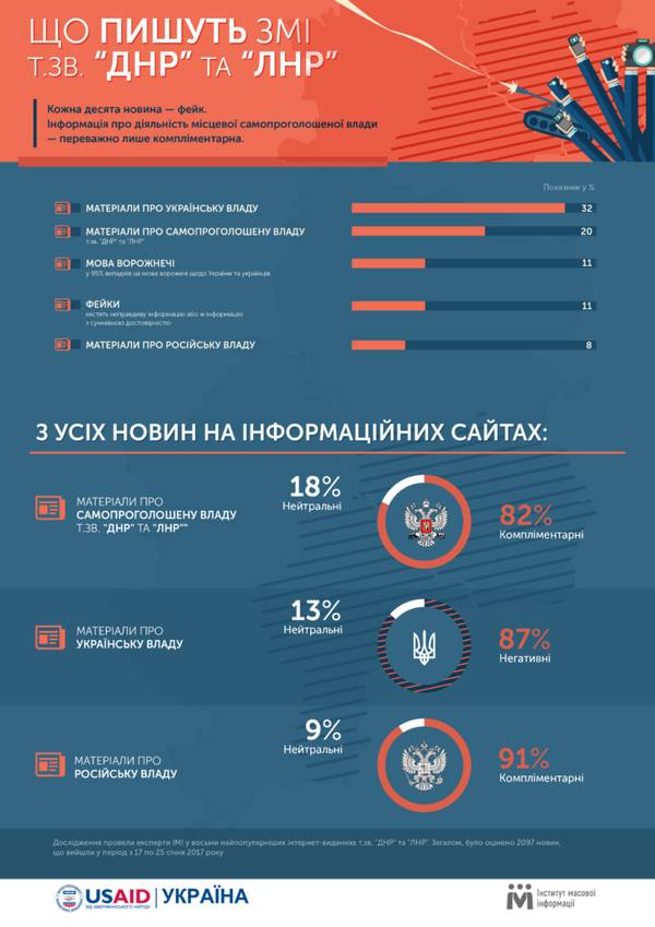 82% матеріалів про самопроголошену владу т.зв. “ДНР” та “ЛНР” в інтернет-ЗМІ на непідконтрольних українській владі територіях Донбасу є компліментарними, 18% є нейтральними, натомість критичних матеріалів немає взагалі.