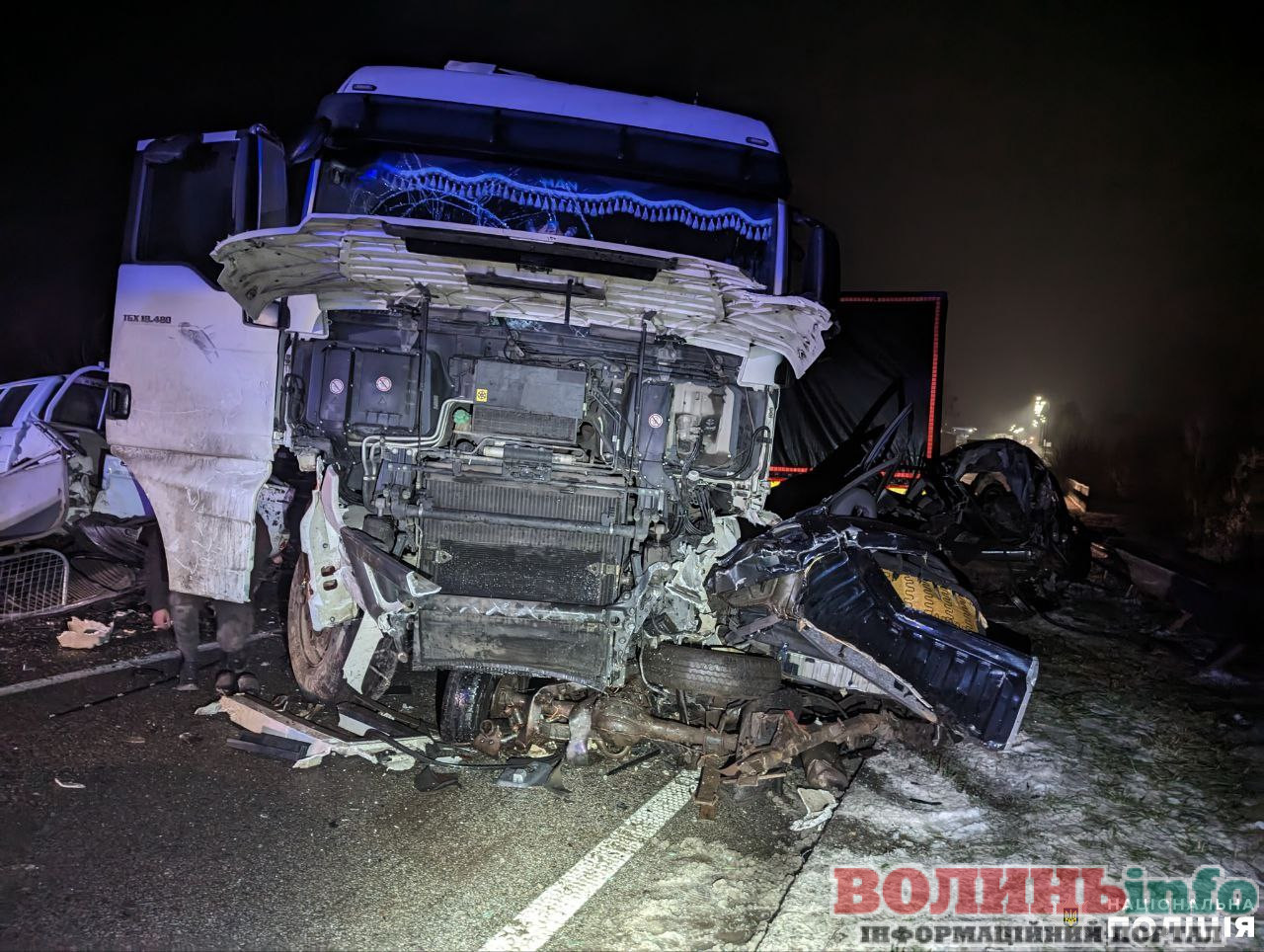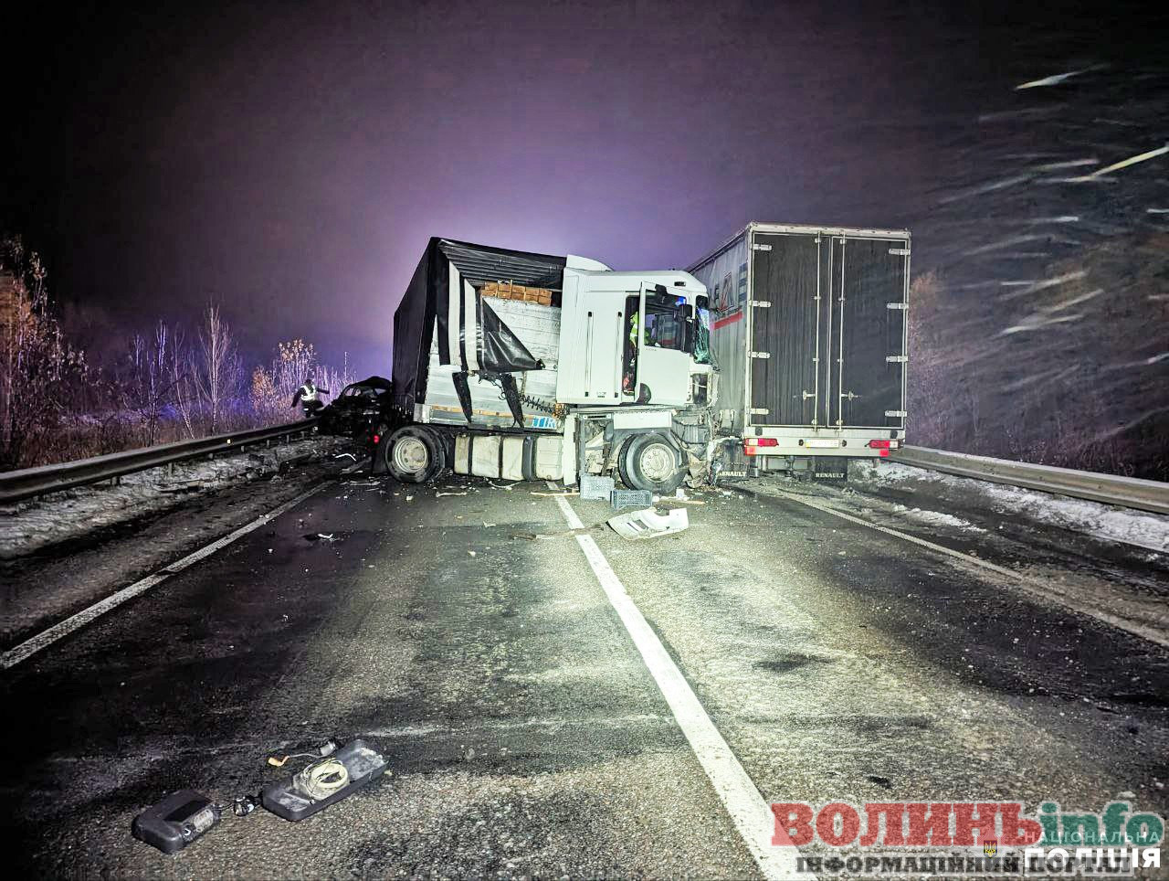 У поліції повідомили, що автотроща сталася внаслідок зіткнення трьох вантажівок: «МАN» з напівпричепом під керуванням 28-річного жителя Костополя, «Renault Premium» під керуванням 41-річного жителя Чернігівщини, «Renault Magnum» з напівпричепом, яким керував 56-річний житель Закарпатської області, та кросовера «Mitsubishi Pagero», який на лафеті перевозив автомобіль.