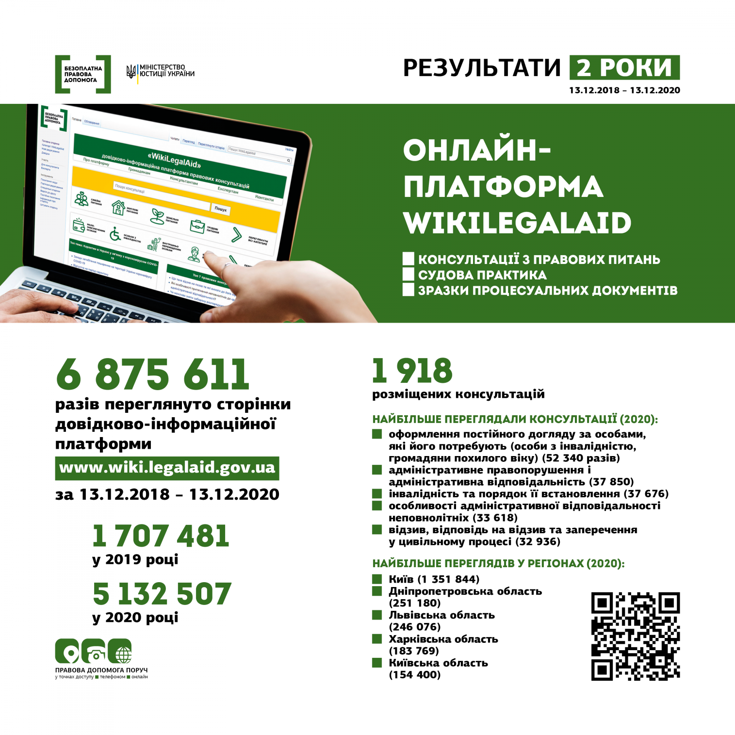 Два роки тому, 13 грудня 2018 року, була відкрита для широкого загалу українська правнича Вікіпедія — довідково-інформаційна платформа правових консультацій «WikiLegalAid» (wiki.legalaid.gov.ua). За цей період матеріали платформи переглянули майже 6,5 млн разів.