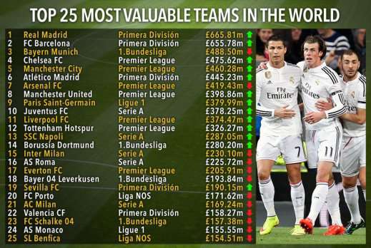Прогнозовано іспанські гранди “Реал” та “Барселона” очолили відповідний рейтинг. Склад “вершкових” більший у ціні на 10 млн, ніж команди каталонців.