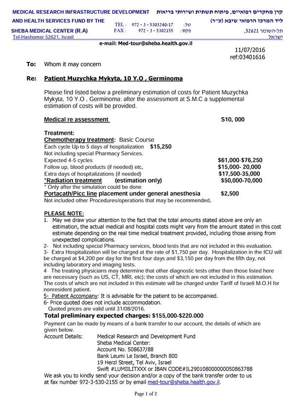 Наразі у Ізраїльській клініці заплановане опромінення краніо-спинальної області, а також буст потиличної зони. Лише після цього буде запропоновано лікування хіміотерапією з повторенням курсів кожні 4-6 тижнів протягом року.