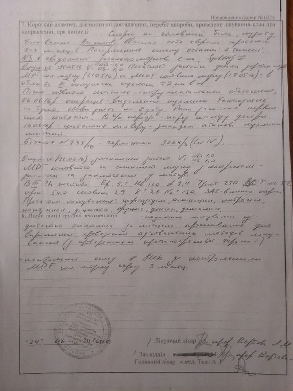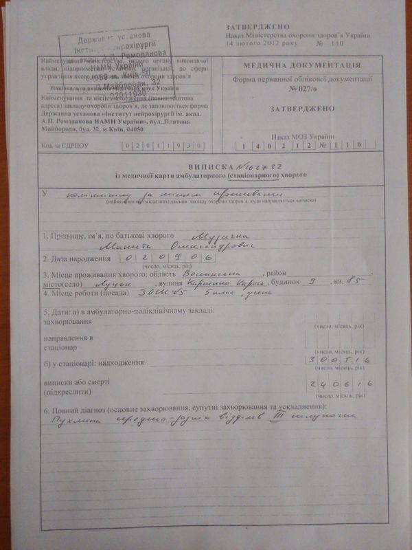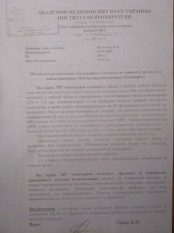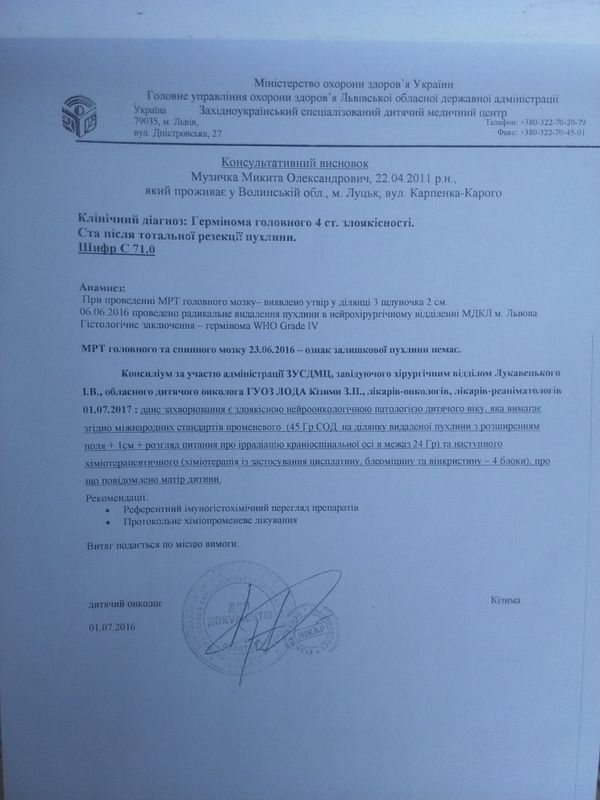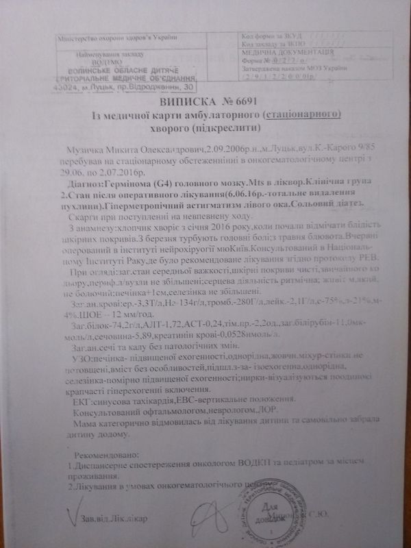 Тепер медичний діагноз звучить, як «гермінома головного мозку 4 ст. злоякісності. Стан після оперативного лікування (06.06.2016 р. – тотальне видалення пухлини). Гіперметропічний астигматизм лівого ока. Сольовий діатез».