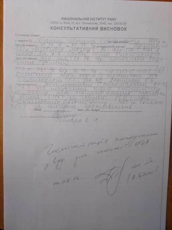 Практично через місяць після проведеної операції (1 липня) було проведено консиліуму за участю адміністрації Західноукраїнського спеціалізованого дитячого медичного центру, завідуючого хірургічного відділу Лукавецького І. В., обласного дитячого онколога ГУОЗ ЛОДА Кізими З. П., лікарів-онкологів та реаніматологів. Усі дійшли до висновку, що дане захворювання є злоякісною нейроонкологічною патологією дитячого віку, яка вимагає згідно міжнародних стандартів променевого та наступного хіміотерапевтичного опромінення.