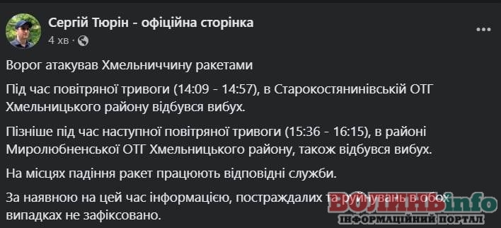 Відбувся пуск ракет і вони попрямували до Хмельницької області у напрямку Старокостянтинова. Оголошення повітряної тривоги відбулося приблизно о 14:09, а вже за 10 хвилин, близько о 14:20, на Хмельниччині був приліт,