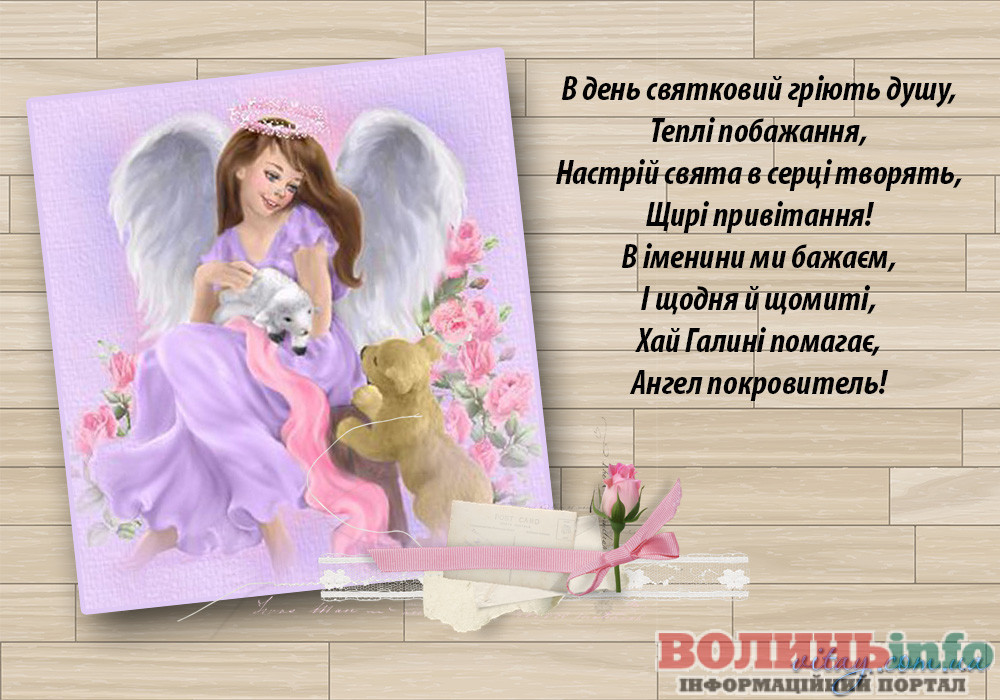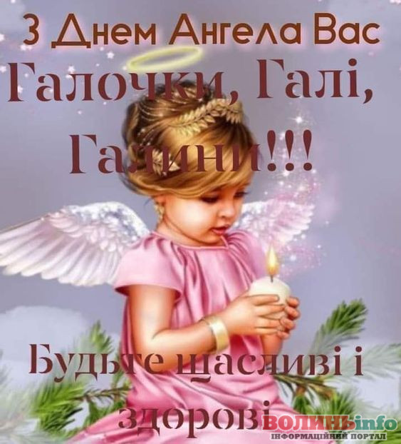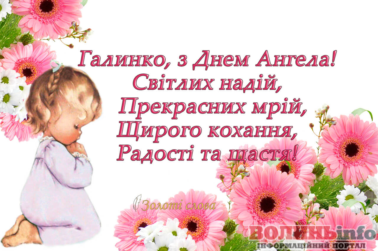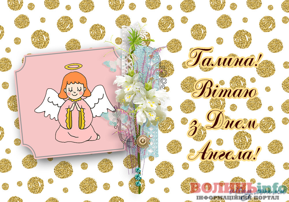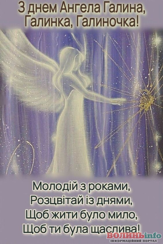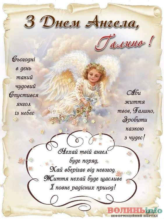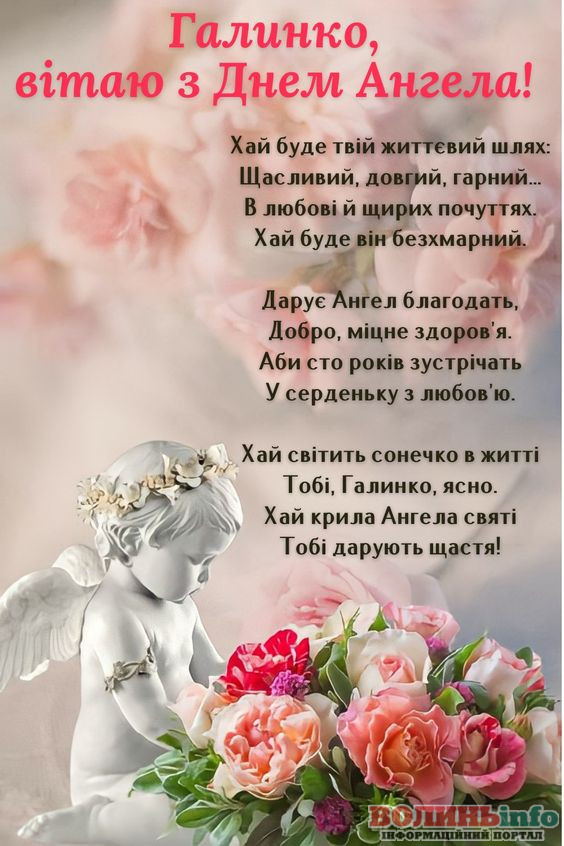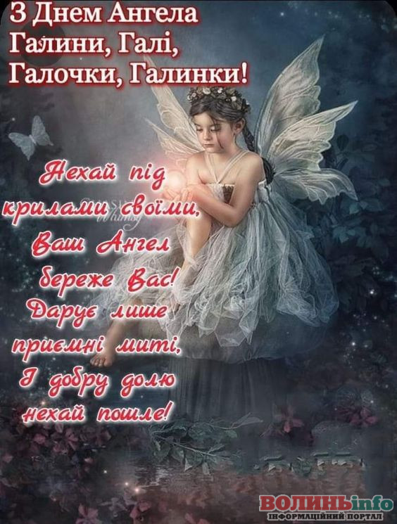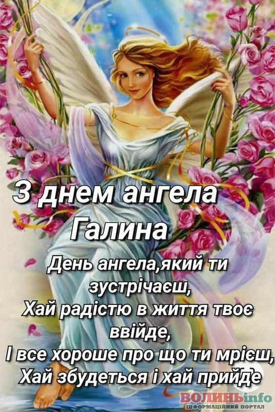 Вітаю з Днем Ангела Галини. Нехай ангел допоможе тобі у важкі хвилини, наділить здоров’ям, любов’ю, посприяє в досягненні поставленої мети і захистить від всього лихого у житті.