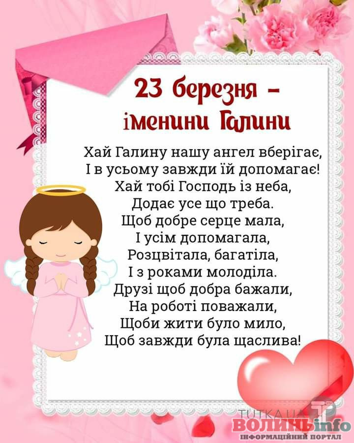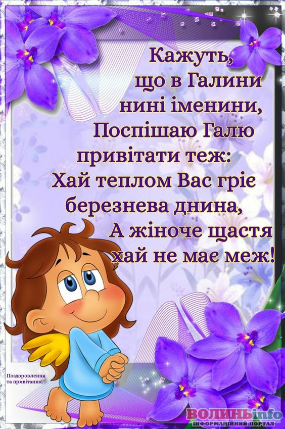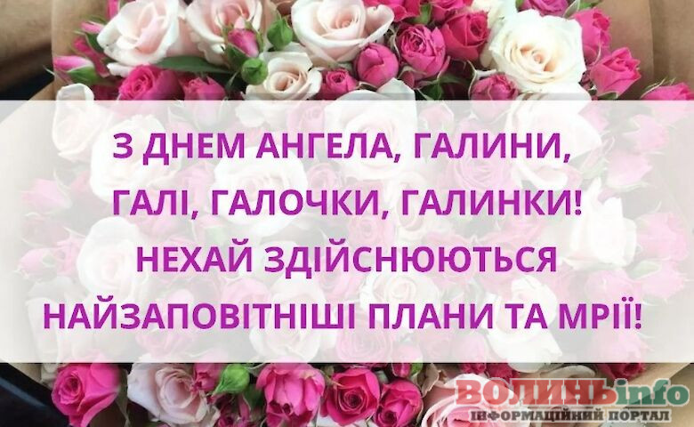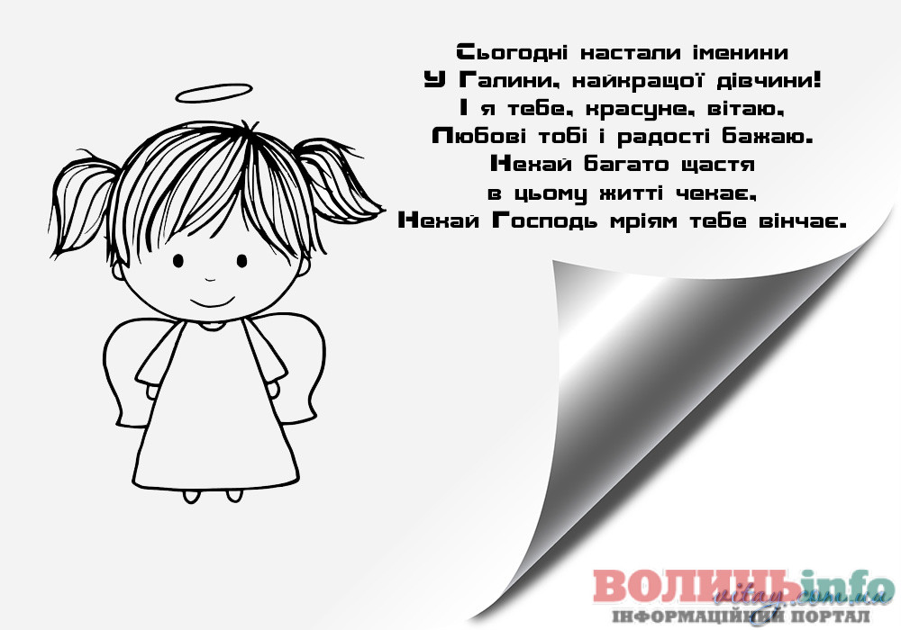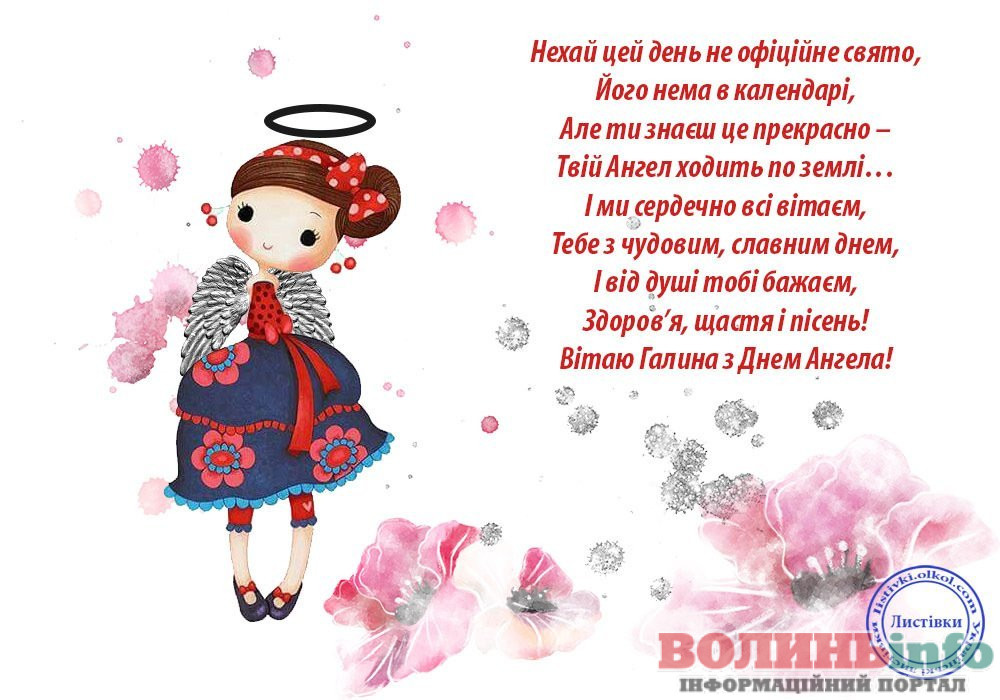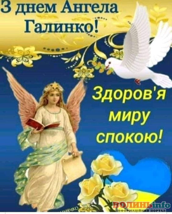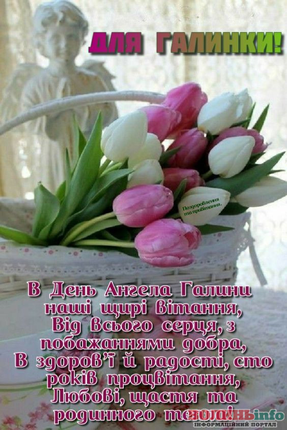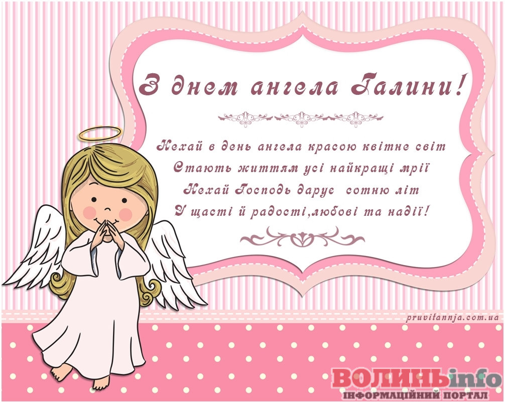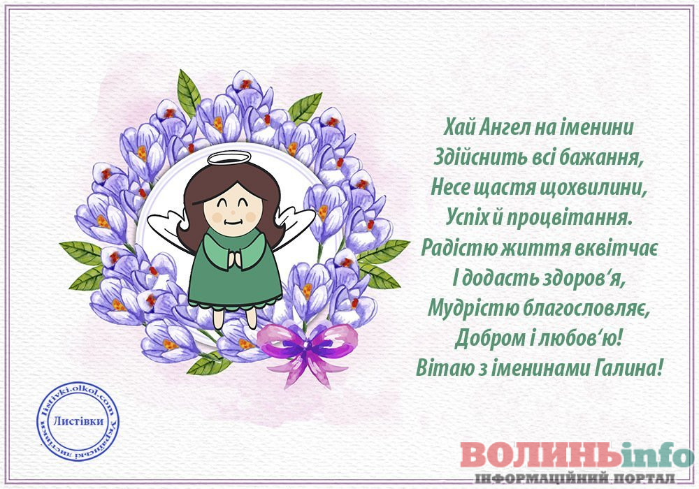 Вітаю з Днем Ангела Галини. Нехай ангел допоможе тобі у важкі хвилини, наділить здоров’ям, любов’ю, посприяє в досягненні поставленої мети і захистить від всього лихого у житті.