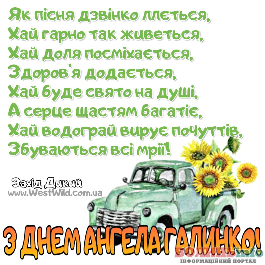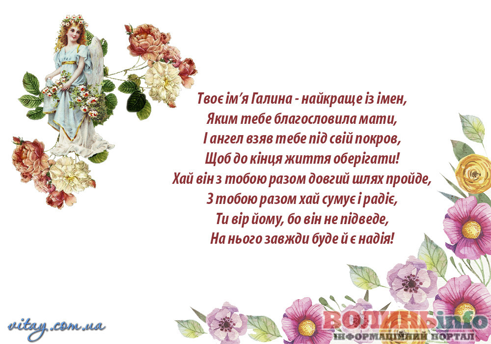 Вітаю, Галина, з цим чудовим святом душі – Днем Ангела. Хочу тобі побажати нев’янучої краси і щирої доброти серця, приємних сюрпризів життя і великих успіхів у твоїх справах, відмінного настрою і чудових життєвих ідей, впевнених сил і чудових друзів.