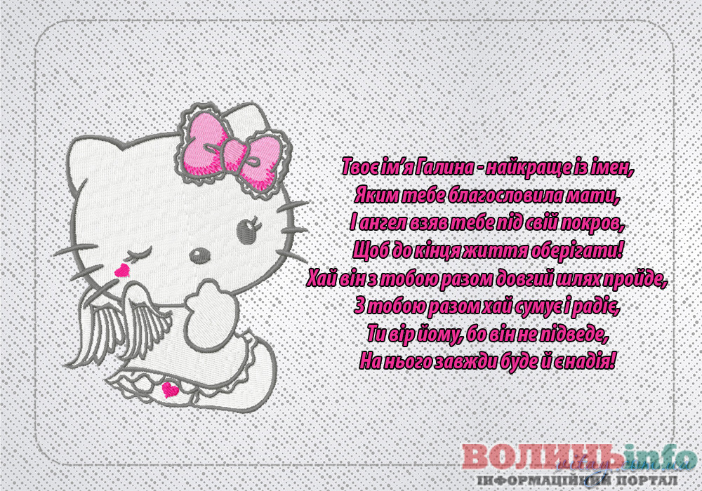 Галина. В День твого Ангела хочу побажати йти по життю з бравими силами, чуйністю серця і добротою душі, роблячи кожен крок впевнено і благородно, вірно і легко. Нехай життя буде щасливим океаном, нехай доля дарує справжню любов і удачу, а твій ангел буде завжди насторожі.