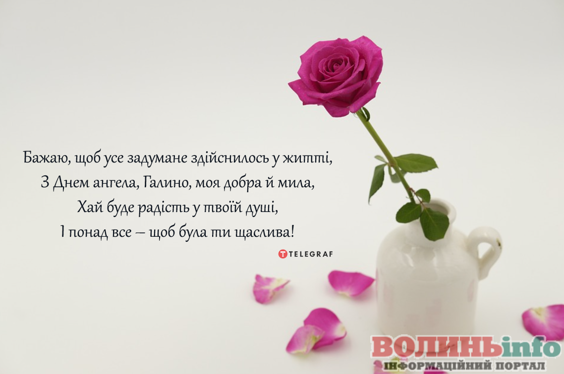 Бажаю в День Ангела Галини великої любові і міцної віри, світлих надій і доброти душі, щирих почуттів і розуміння з близькими, мудрих рішень і благих вчинків. Хай ангел завжди тебе вберігає від всього лихого.