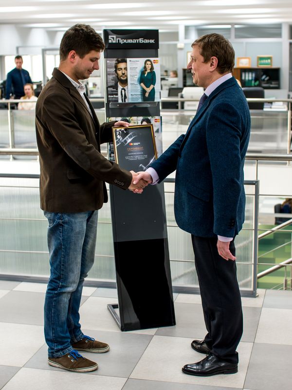 Привітав переможця та вручив йому подарунковий сертифікат директор київської філії ПриватБанку РЦ Олег Ганоцький. Він побажав Роману Дудченку успіху в інших акціях, які банк наразі готує для своїх клієнтів.