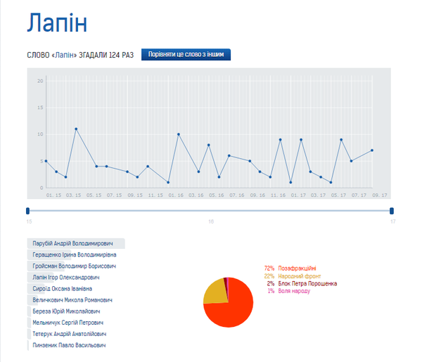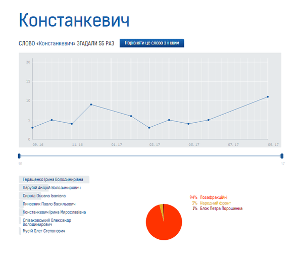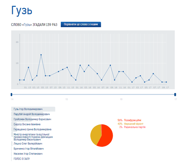 Сервіс «Стенограми» визначив, що найчастіше в залі парламенту звучало прізвище народного депутата Ігоря Гузя. Варто наголосити на тому, що сам Ігор Гузь, представляючись, називає своє прізвище кожного разу перед своїми виступами. Окрім нього самого його прізвище часто називають: голова Верховної Ради України Андрій Парубій, Прем’єр-міністр України Володимир Гройсман, заступник голови Верховної Ради України Оксана Сироїд, перший заступник голови Верховної Ради України Ірина Геращенко та Міністр енергетики та вугільної промисловості України Володимир Демчишин.