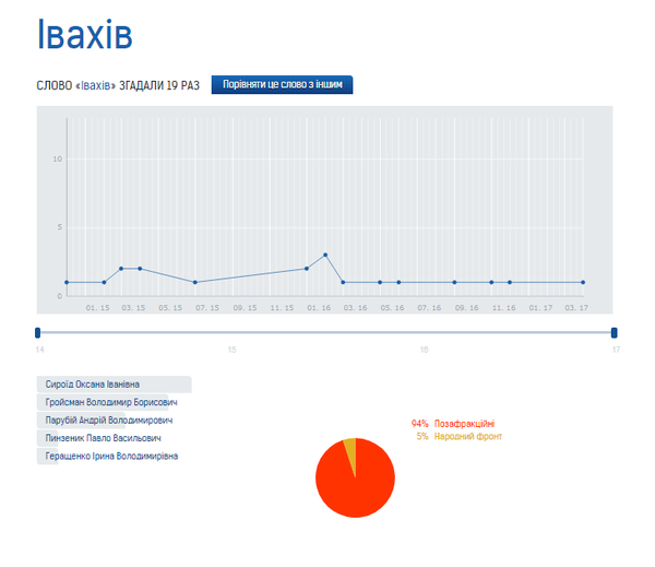 Так само жодного разу не виступав у парламенті під час пленарних засідань народний депутат України Степан Івахів. Втім, його прізвище звучало у сесійній залі 19 разів за два роки. Зокрема, найчастіше його називають: заступник голови Верховної Ради України Оксана Сироїд, голова Верховної Ради України Андрій Парубій, Прем’єр-міністр України Володимир Гройсман, народний депутат Павло Пинзеник та перший заступник голови Верховної Ради України Ірина Геращенко.
