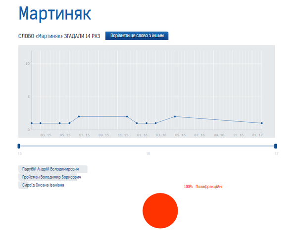 За допомогою інструменту «Стенограми», який можна знайти на сайті РАДА ОПОРА, експерти легко визначили прізвище волинського нардепа, яке найчастіше звучало у сесійній залі парламенту. Так, з 27 листопада 2015 р. по 14 жовтня 2017 р. прізвище Мартиняк звучало у залі ВРУ 14 разів, Івахів – 19 разів, Констанкевич – 55 разів, Лапін – 124 рази, Гузь – 139 разів. Для порівняння, одним із найпопулярніших прізвищ, що звучали за два роки у ВРУ, є прізвище Ляшко. Його називали 1950 разів.