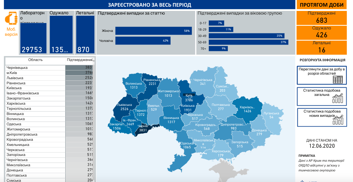 Станом на п’ятницю, 12 червня, в Україні зафіксовані 29 753 випадки зараження китайським коронавірусом. Про це свідчить карта коронавірусу, опублікована на сайті Центру громадського здоров’я.