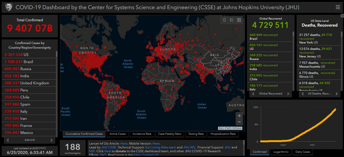 Станом на ранок четверга, 25 червня, китайський коронавірус Covid-19 у світі знайшли у понад 9 млн 407 тисяч осіб. За добу кількість інфікованих зросла на понад 166 тисяч осіб, а жертв вірусу стало більше на 5 тисяч 224 особи.
