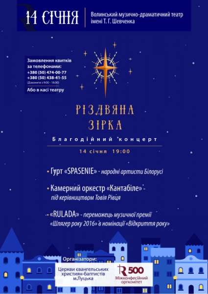 Також у суботу стартує річний благодійний марафон в рамках відзначення в Україні 500-річчя Реформації, спрямований на збір коштів для допомоги дітям з обмеженими можливостями, які потребують хірургічного втручання. Початком марафону стане благодійний концерт «Різдвяна зірка». Учасники концерту: народні артисти Білорусі – гурт «SPASENIE», камерний оркестр «Кантабіле» під керівництвом Товія Рівця та переможець музичної премії «Шлягер року 2016» в номінації «Відкриття року» – «Rulada». Місце проведення – драмтеатр. Початок – о 19:00. Телефони для довідок – 050 47 40 077, 050 43 84 155.