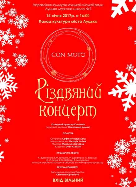 У суботу запрошуємо на різдвяний концерт камерного оркестру «Con Moto» Луцької музичної школи № 2. У програмі звучатимуть твори К. Дженкінса, Г. Ф. Генделя, А. Вівальді, Й. С. Баха, К. М. Вебера, Р. Сакамото, Е. Морріконе та українські колядки в обробці для камерного оркестру. Місце проведення – Палац культури міста. Початок – о 16:00. Вхід – вільний!