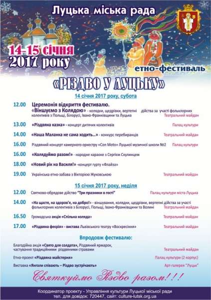 У суботу та неділю у Луцьку відбуватиметься етнофестиваль «Різдво у Луцьку». У рамках фестивалю лучани та гості міста зможуть взяти участь у громадській акції «Спільна коляда». Окрім того обіцяють конкурс перебиранців, народне караоке з Сергієм Скулинцем, етно-дискотеку з Вікторією Жуковською та «Різдвяну казку» з Тетяною Ціхоцькою, виступ гурту «Флайза», світлоінсталяція та вогняне шоу у виставі «Різдвяна феєрія» Львівського театру на ходулях «Воскресіння». Також діятиме «Різдвяна майстерня», де можна власноруч при допомозі майстрів створити різдвяний атрибут. В арт-галереї «Луцьк» експонуватиметься виставка «Янголи співають – Різдво зустрічають». У рамках фестивалю відбудеться благодійна акція «Свято для солдата», а також різдвяний ярмарок і частування традиційними різдвяними стравами. Місце проведення – Театральний майдан. Відкриття фестивалю – в суботу о 12:00.