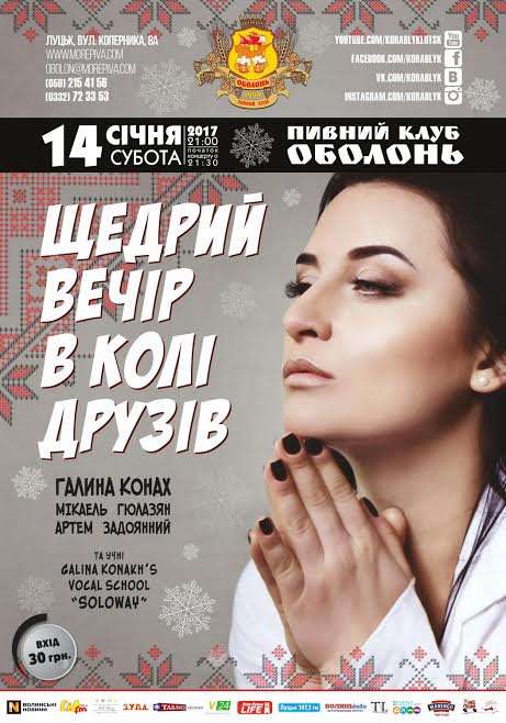 У суботу паб «Кораблик» пропонує насолодитися концертом Галини Конах, Мікаеля Гюлазяна та Артема Задоянного. Також виступатимуть учні вокальної школи «SoloWay». Гратимуть джаз-фольк-поп-модерн, етно, виконуватимуть кавери. Після концерту будуть танці від Тіми. Початок – о 21:30. Телефон для довідок – 050 21 54 156, (0332) 72 33 53.