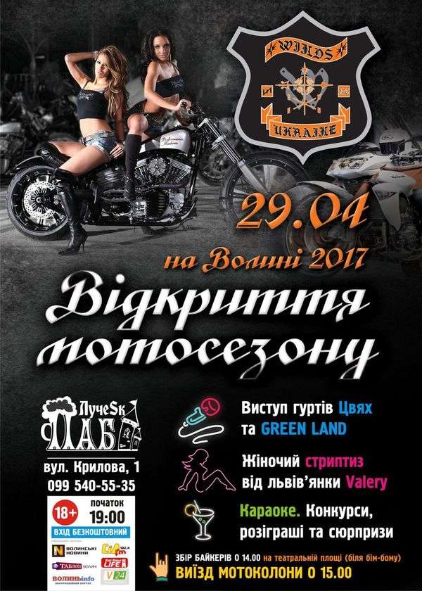 У суботу «ЛучеSк-паб» запрошує на відкриття мотосезону. Виступатиме гурт «Цвях» та «Green Land». У програмі – караоке, конкурси та сюрпризи, жіночий стриптиз. Вхід – вільний, 18+! Збір байкерів на Театральному майдані – о 14:00, виїзд колони – о 15:00. Початок – о 19:00. Телефон для довідок – 099 540 55 35.
