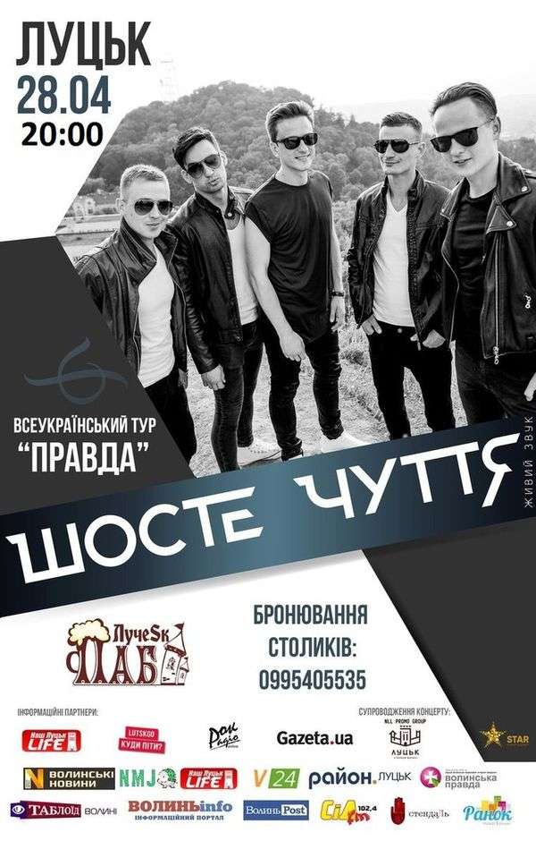 Сьогодні, вечір п’ятниці, «ЛучеSк-паб» пропонує провести на концерті гурту «Шосте чуття». Концерт відбудеться у рамках всеукраїнського туру «Правда». Початок – о 20:00. Телефон для довідок – 099 540 55 35.