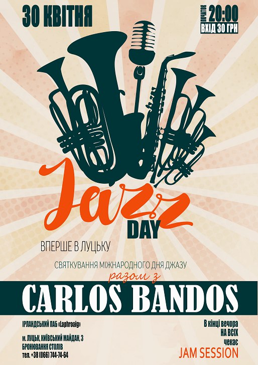 У неділю пропонуємо завітати на святкування Міжнародного дня джазу. Виступатиме новий луцький гурт «Carlos Bandos». Місце проведення – паб «Лафройг» (вул. Київський майдан, 3). Вхід – 30 грн. Початок – о 20:00. Телефон для довідок – 066 744 74 64.