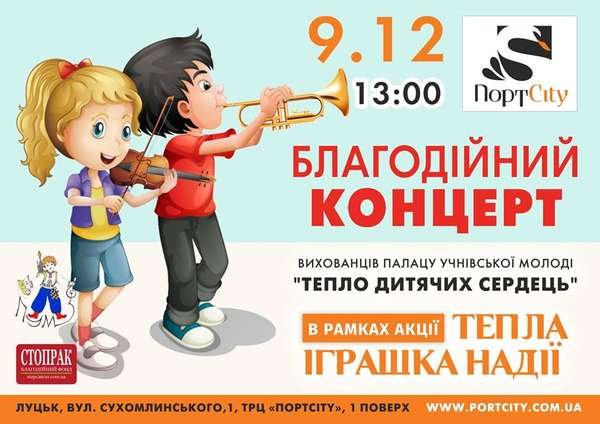 У суботу пропонуємо побувати на благодійному концерті вихованців палацу учнівської молоді «Тепло дитячих сердець», який відбудеться в рамках акції «Тепла іграшка надії». Місце проведення – ТРЦ «Порт Сіті». Початок – о 13:00.