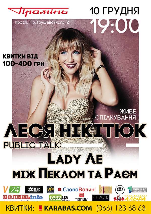 У неділю пропонуємо побувати на живому спілкуванні із Лесею Нікітюк. Місце проведення – РЦ «Промінь». Вартість квитка – 100–400 грн. Початок – о 19:00.