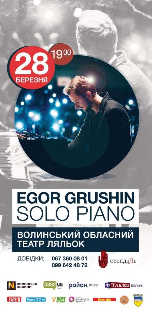 У вівторок пропонуємо відвідати концерт Єгора Грушина. Піаніст презентує програму «Solo Piano». Місце проведення – Волинський обласний академічний театр ляльок. Початок – о 19:00. Телефони для довідок – 067 36 00 801, 099 64 24 872.