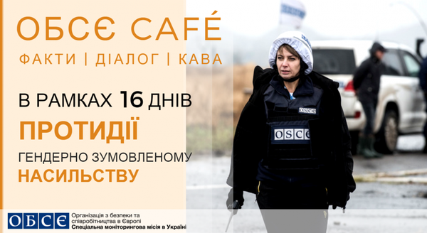 У середу пропонуємо підтримати міжнародну ініціативу 16 днів протидії гендерно зумовленому насильству», Спеціальна моніторингова місія ОБСЄ в Україні (СММ) проводить серію зустрічей-презентацій – ОБСЄ Café. До участі в них запрошуються всі бажаючі охочі. Учасники матимуть можливість дізнатися про роботу СММ з гендерних питань, почути виступи експертів, обговорити низку суспільно-важливих питань, серед яких гендер та гендерно зумовлене насильство, роль та проблеми жінок під час конфліктів, виконання в Україні резолюції Радбезу ООН «Жінки, мир та безпека» та інші. У програмі заходу – виступи членів Спеціальної моніторингової місії ОБСЄ в Україні (СММ), а також запрошених спікерів: Оксани Гобод (голова регіонального Департаменту соціального захисту), Людмили Матьошук (представник неурядової організації “Гендерний Центр”) та Олени Черенкової (журналістка та голова громадської організації “Переселенці Криму та Донбасу”).