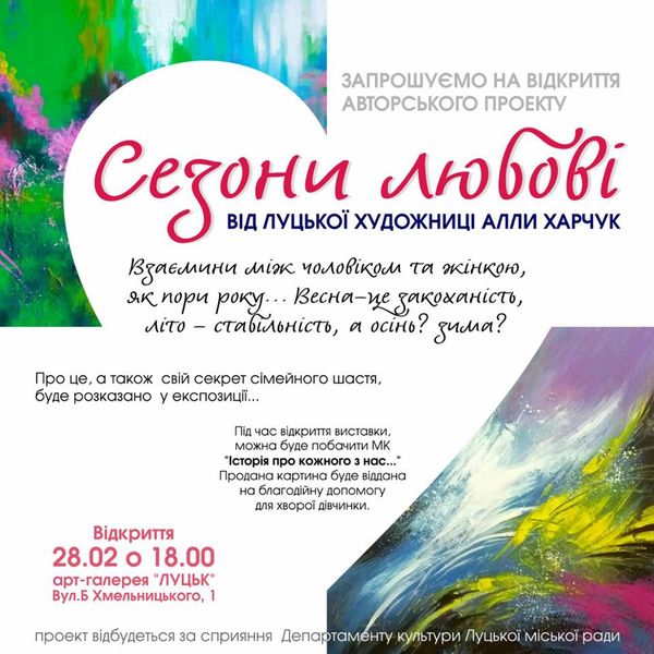 Рекомендуємо побувати у вівторок на відкритті персональної виставки луцької художниці Алли Харчук «Сезони любові». Художниця розкаже про свій секрет сімейного щастя. Також продаватимуть картину, кошти з якої перерахують на допомогу для хворої дівчинки. Під час виставки проведуть майстер-клас «Історія про кожного з нас». Місце проведення – Палац культури міста Луцька, (арт-галеря «Луцьк»). Початок – о 18:00.