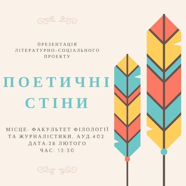 У вівторок запрошуємо на презентацію літературно-соціального проекту «Поетичні стіни». Місце проведення – факультет журналістики та філології Східноєвропейського університету імені Лесі Українки, аудиторія – 402 (вул. Винниченка, 30 а). Початок – о 13:30.