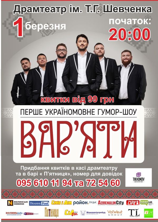 Також у середу пропонуємо побувати на гумор-шоу «Вар’яти». У програмі шоу традиційні як для формату stand-up comedy монологи, мініатюри, гітарні номери, так і пошук власних «родзинок»: відеозамальовки, «картинні галереї» і т. і. «Вар’яти-шоу» позбавлене матюків та російської мови. Відразу буде два концерти підряд. Місце проведення – драмтеатр імені Т. Г. Шевченка. Квитки – від 99 грн. Початок – о 17:30 та 20:00.