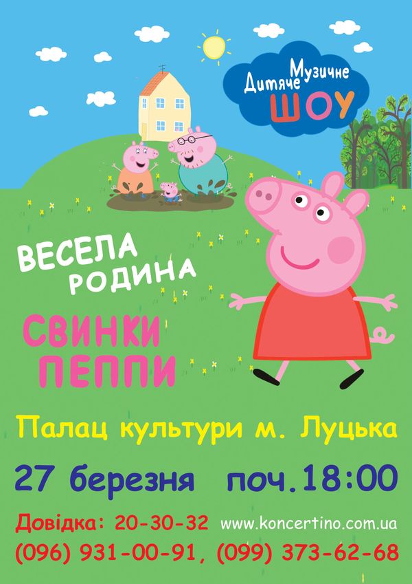 У понеділок пропонуємо завітати сім’єю на дитячу веселу інтерактивну виставу «Весела родина Свинки Пеппи». Динамічне шоу, сповнене добрими жартами, веселими піснями, танцями й іграми за участю великих ляльок та маленьких глядачів. Упродовж вистави діти познайомляться з родиною Свинки Пеппи: мамою Свинкою, татом Свином, братиком Джорджем, самою Пеппою ті її друзями кроликом Ребеккою та вівцею Сьюзі. Місце проведення – Палац культури. Вхід – 60–150 грн. Дітям до 4 років вхід безкоштовний (на руках у дорослих). Початок – о 18:00. Телефони для довідок – 096 931 00 91, 099 373 62 68, (0332) 20-30-32.