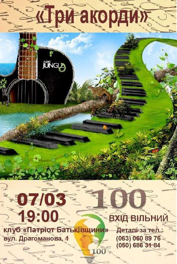 У вівторок запрошуємо на перший, весняний акустичний вечір «Три акорди», де місцеві музиканти гратимуть відомі композиції, демонструючи свою майстерність та даючи відвідувачам можливість поспівати улюблених пісень. Місце проведення – клуб «Патріот Батьківщини» (вул. Драгоманова, 1). Вхід – вільний! На заході збиратимуть кошти для лікування дітей, хворих на рак. Зібрану суму передадуть для БФ «СТОПРАК». Початок – о 19:00.