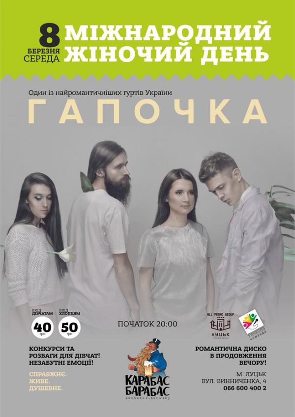 Також у середу відбудеться концерт гурту «Гапочка», переможці Global Battle of the Bands. Місце проведення – пивний клуб-броварня «Карабас-Барабас». Будуть також конкурси, розваги та дискотека. Вхід: дівчатам – 40 грн, хлопцям – 50 грн. Початок – о 20:00. Телефон для довідок – 066 600 40 02.