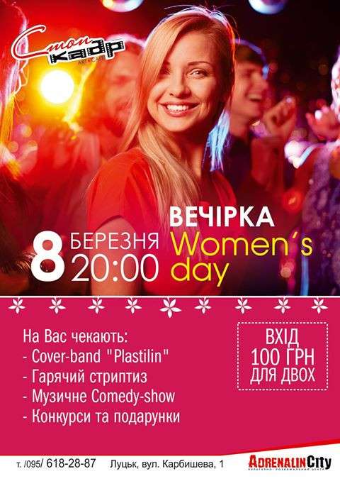 У середу пропонуємо завітати панянкам на романтичну вечірку «Women’s Day». У програмі: жартівливі конкурси, подарунки, виступ кавер-бенду «Пластилін» та музичне камеді-шоу гостей з Києва. На закінчення – дискотека. Місце проведення – арт-кафе «Стоп-Кадр» («Адреналін Сіті»). Вартість – 100 грн. Початок – о 20:00. Телефон для довідок – 095 61 82 887.